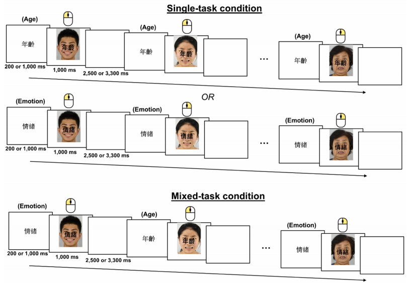 任务采用面孔判断范式,即顺利获得随机施加线索(“年龄”或“情绪”)诱导被试进行任务切换。